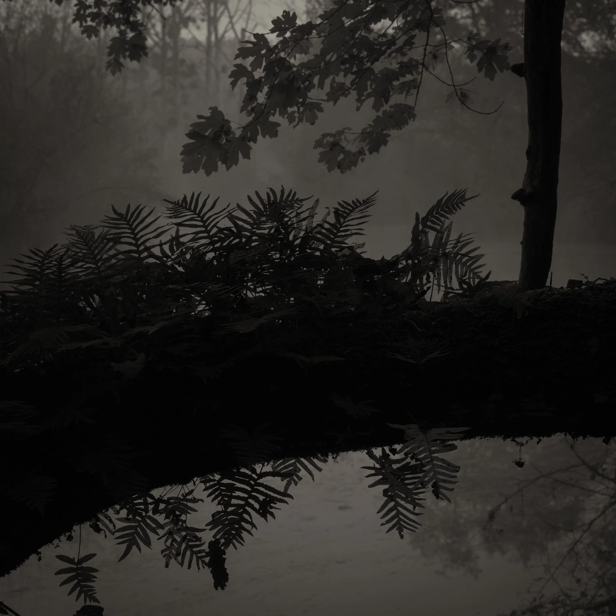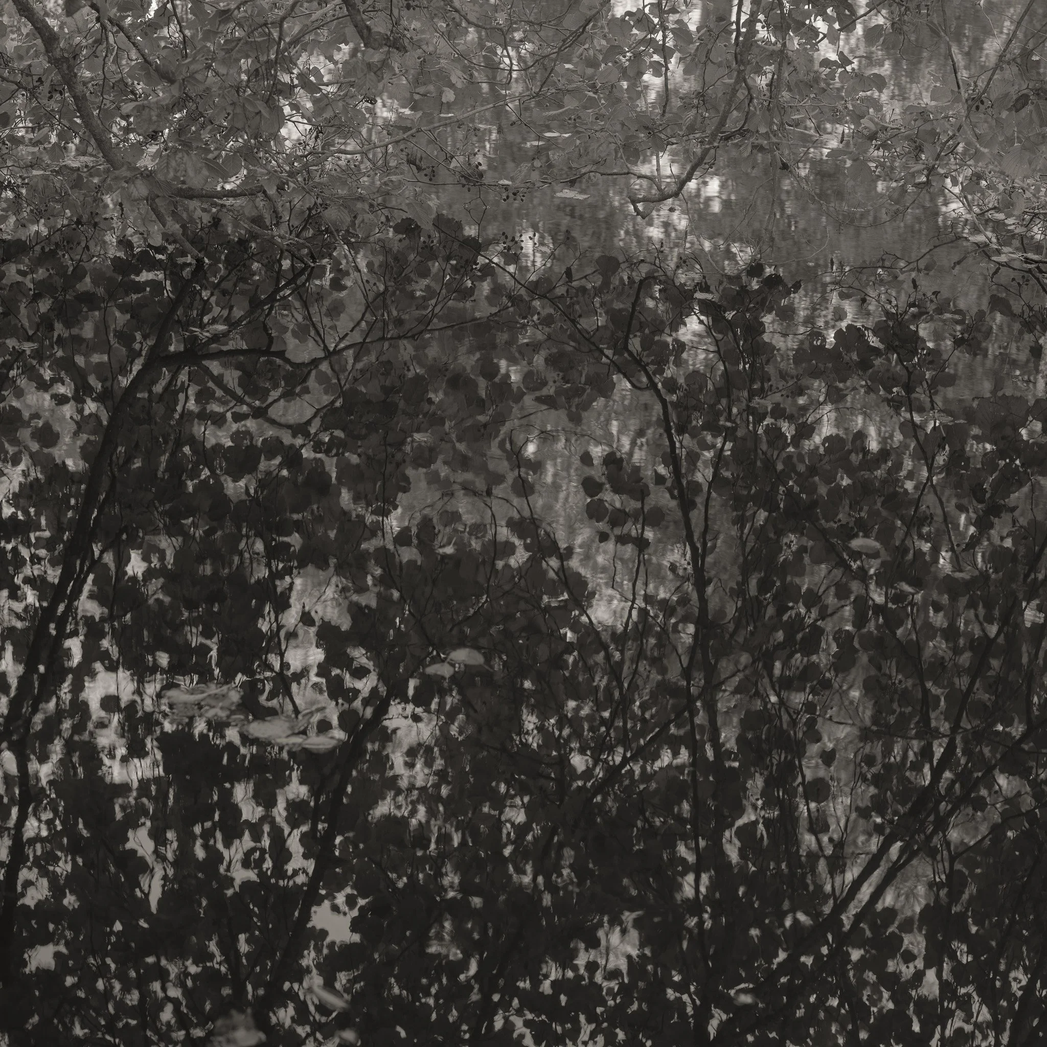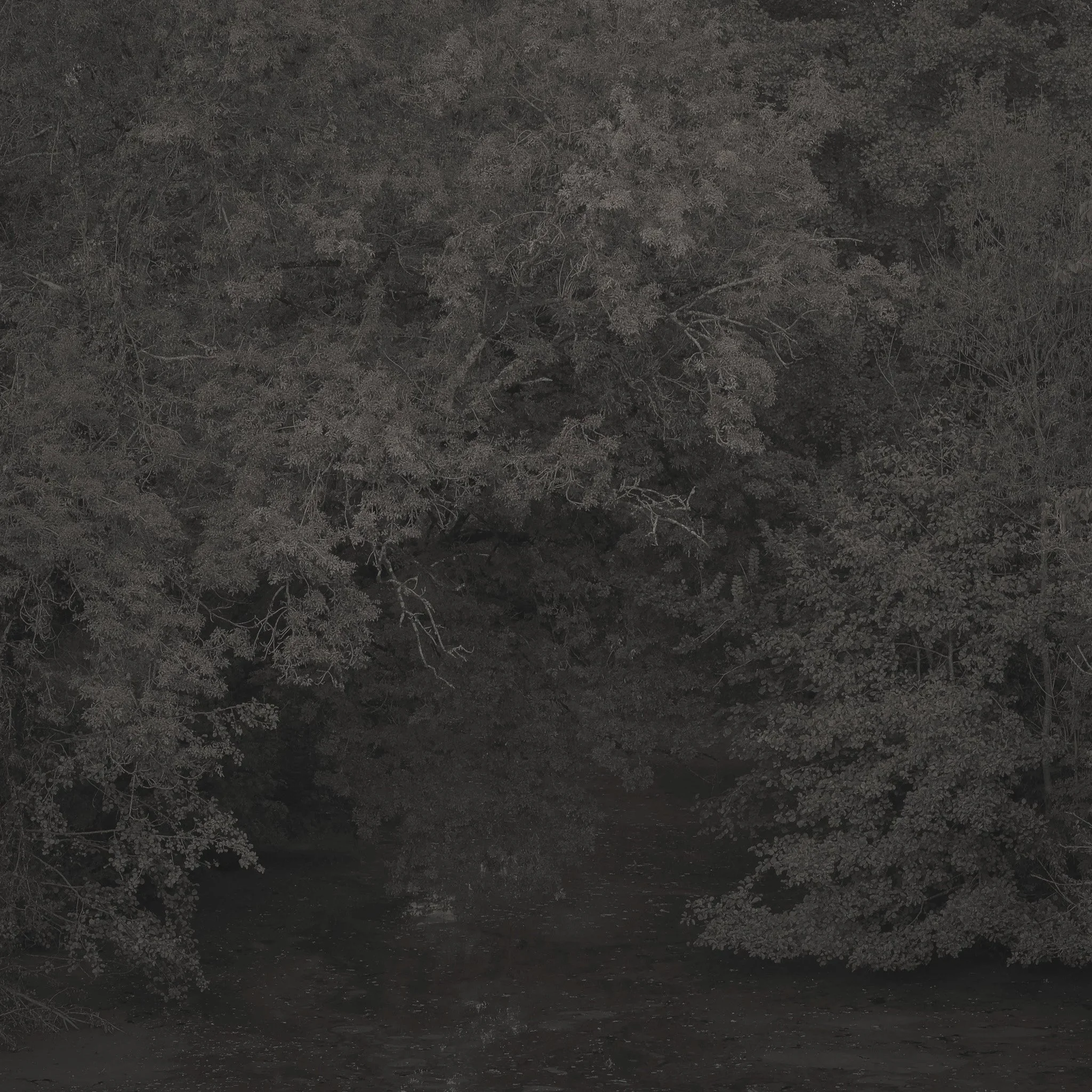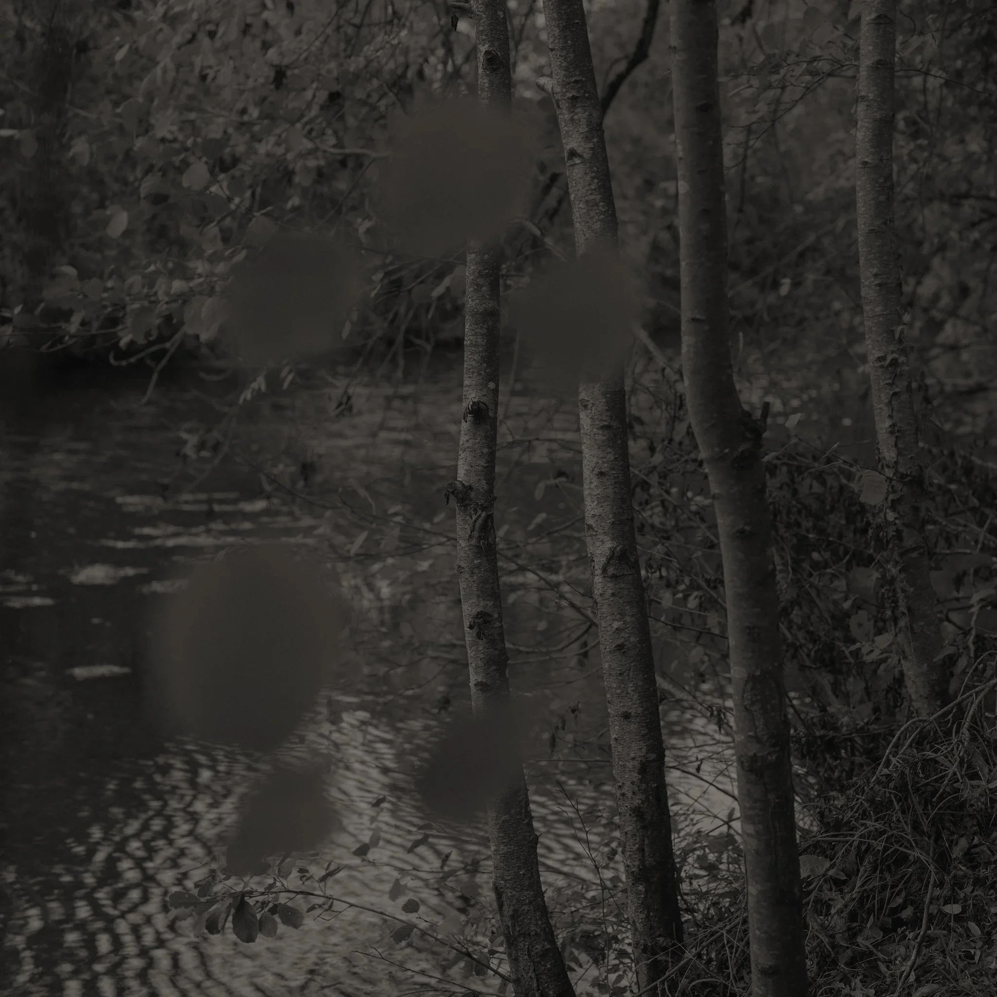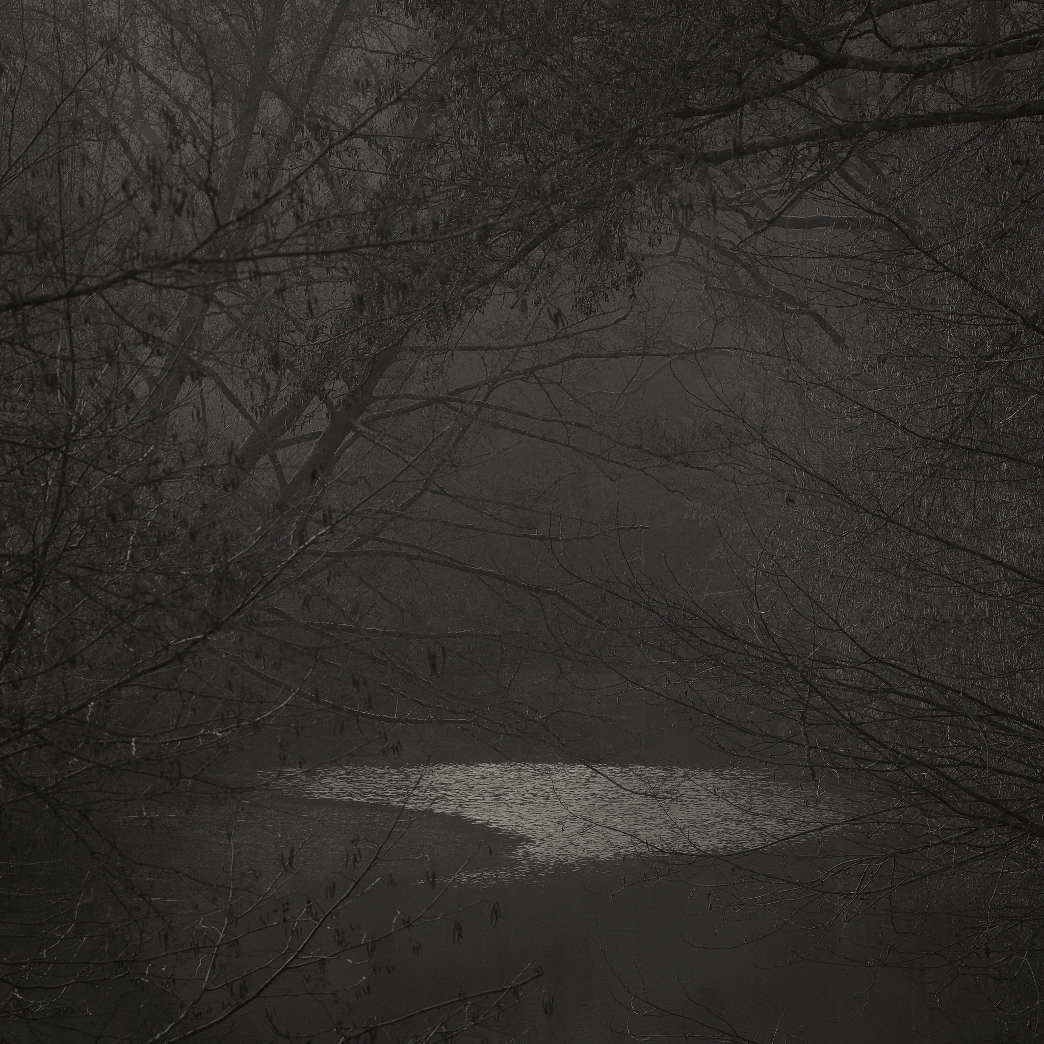 Le projet Green River est né d’une forme de sidération sauvage lorsqu’un véritable mur végétal s’est dressé devant moi un jour en déployant ses milliers de nuances du vert. Les branches des arbres centenaires s’emmêlaient aux ronces de plusieurs mètres qui interdisaient par moment le passage sur le chemin qui longeait la rivière. La Grande Maine se frayait la voie au milieu de cette forêt dense qui abritait de nombreuses espèces d’oiseaux et de mammifères sauvages. Elle offrait les ressources à tout le vivant qui campait sur ses deux rives. En explorant chaque jour ses méandres, elle est devenue également pour moi une ressource naturelle qui nourrit mon imagination. Des matinées brumeuses aux nuits de pleine lune quand sa lumière argentée se reflète dans ses eaux, de l’été sec, quand son niveau baisse mettant à nu les racines des arbres qui s’abreuvent dans son lit, à l’automne, quand sous la pluie abondante la mousse recouvre d’un vert profond les roches apparentes qui bordent son cours, la rivière m’offre au fil des jours cette substance perceptible, quasi monochrome à laquelle ma photographie tente d’apporter une nouvelle matérialité.