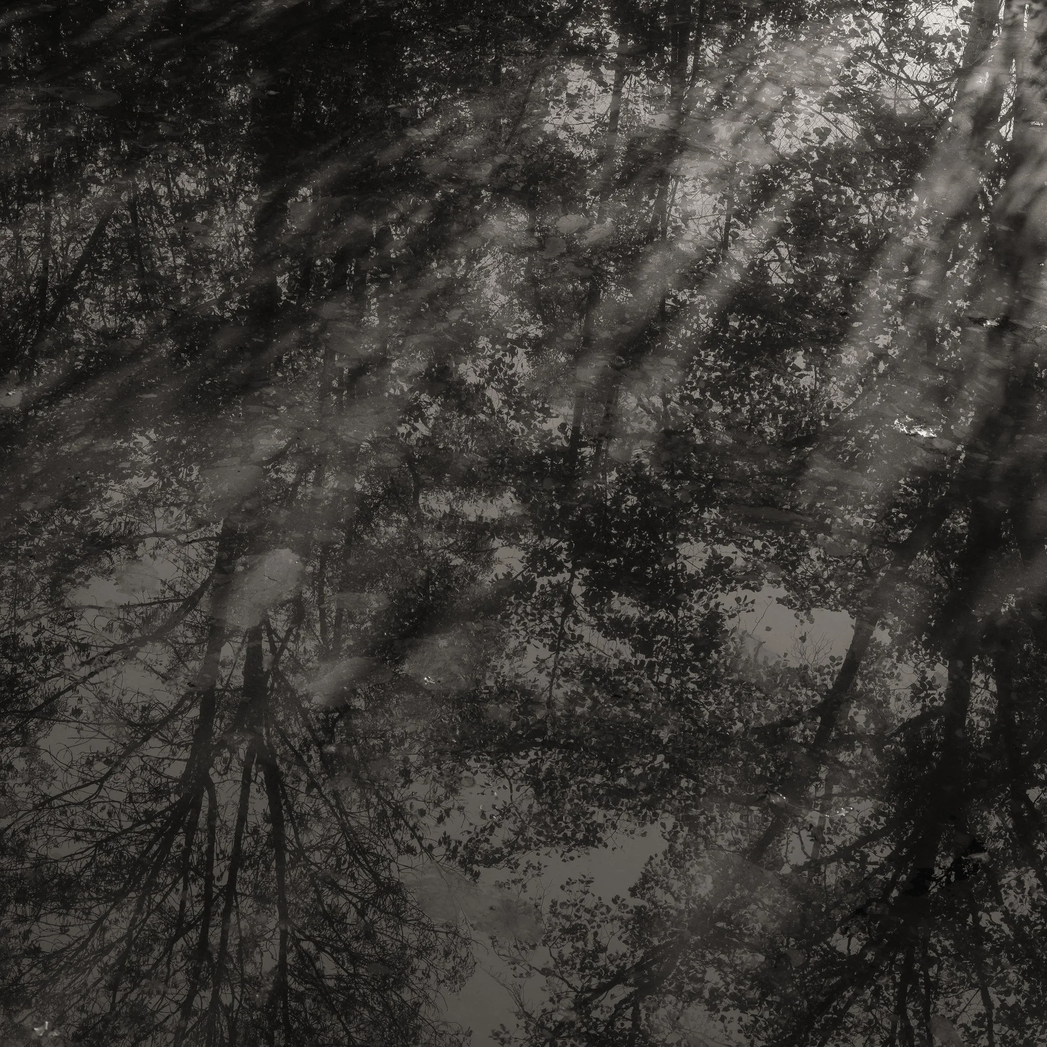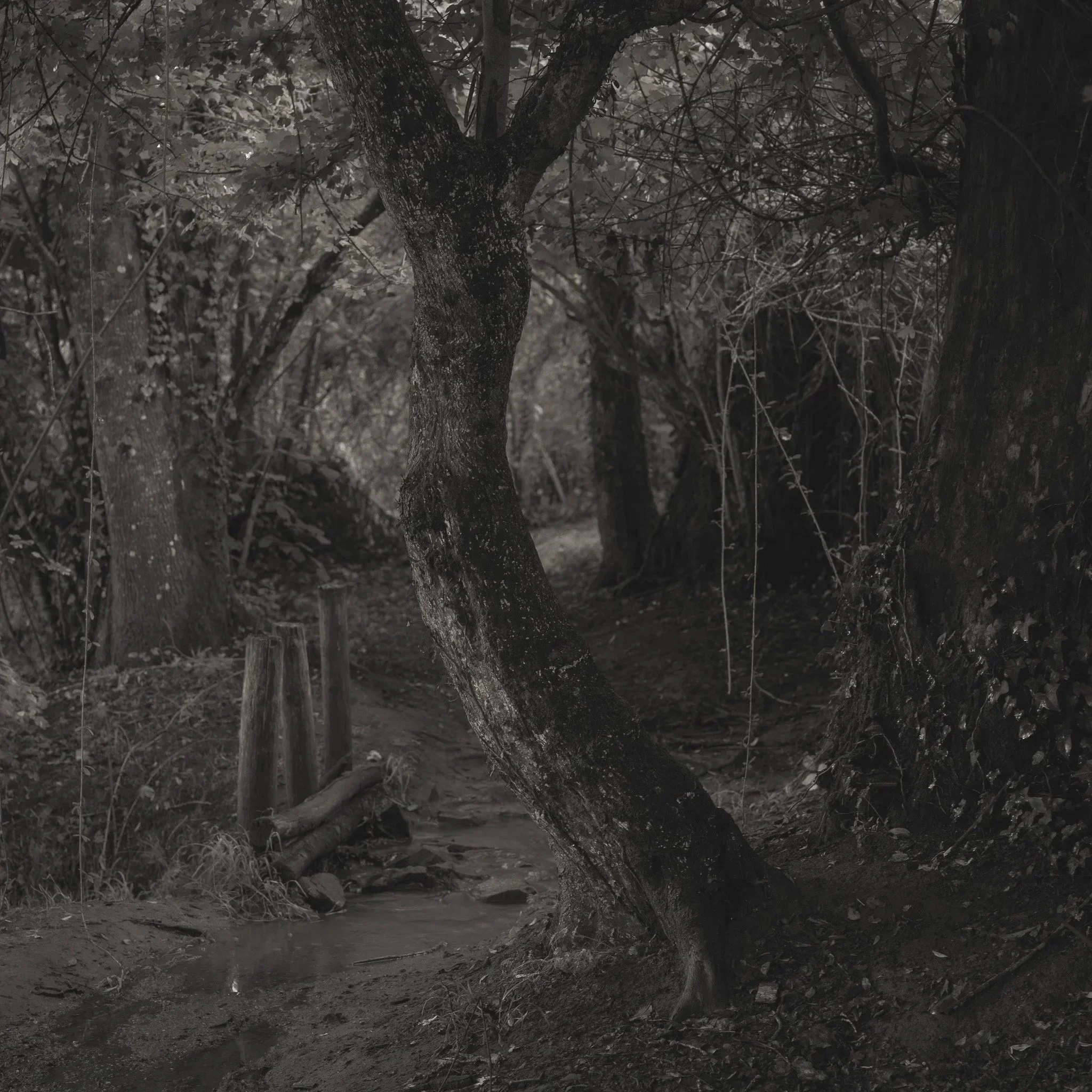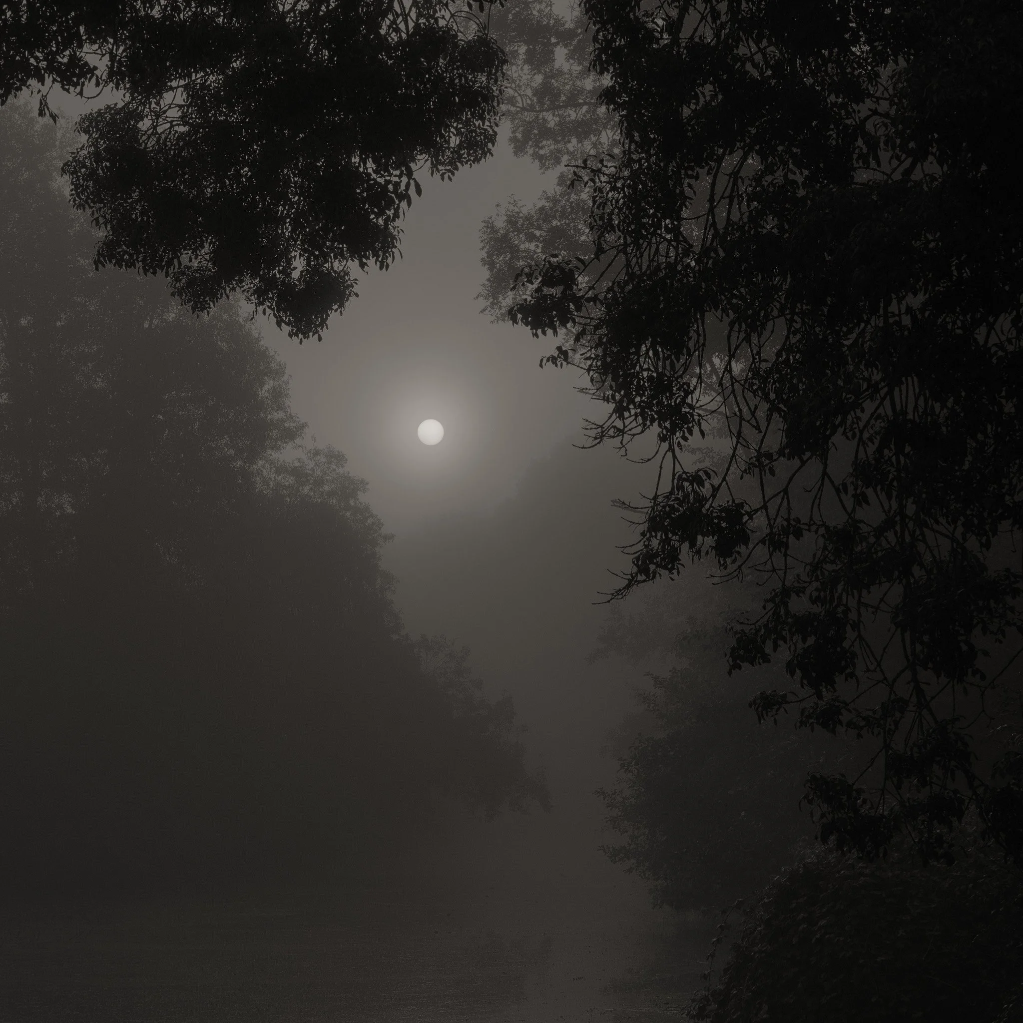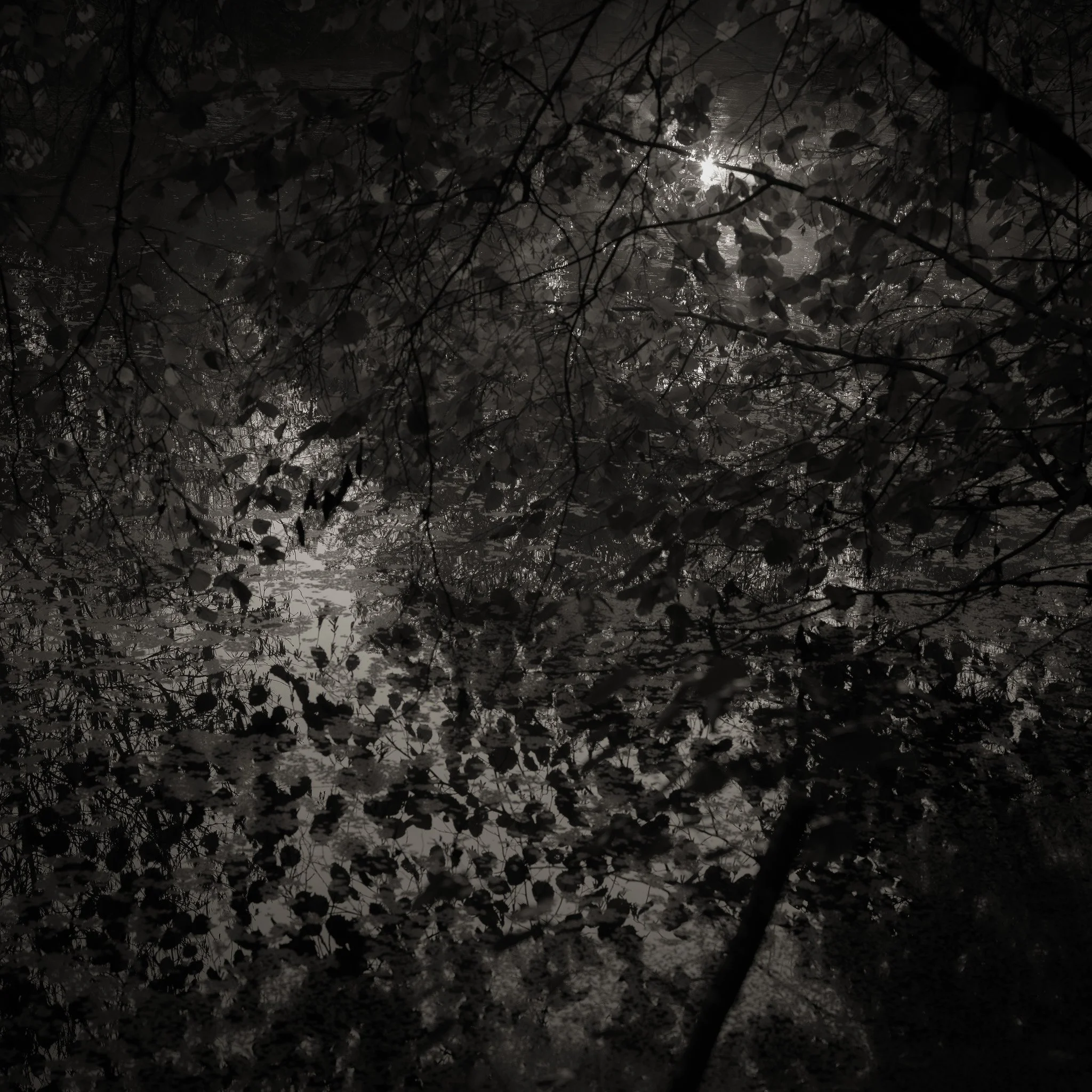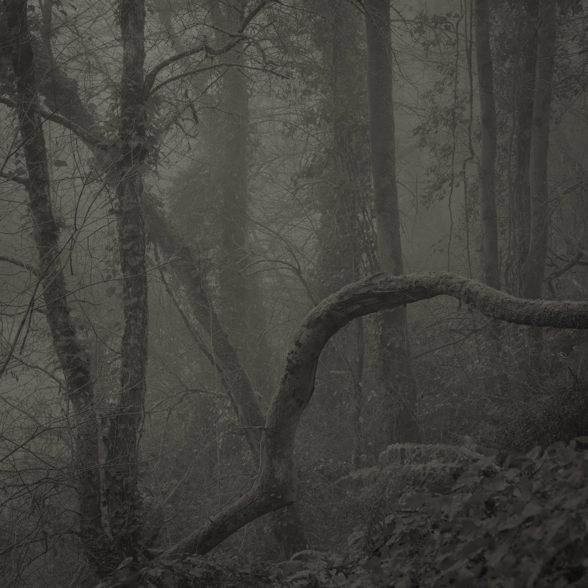 Le projet Green River est né d’une forme de sidération sauvage lorsqu’un véritable mur végétal s’est dressé devant moi un jour en déployant ses milliers de nuances du vert. Les branches des arbres centenaires s’emmêlaient aux ronces de plusieurs mètres qui interdisaient par moment le passage sur le chemin qui longeait la rivière. La Grande Maine se frayait la voie au milieu de cette forêt dense qui abritait de nombreuses espèces d’oiseaux et de mammifères sauvages. Elle offrait les ressources à tout le vivant qui campait sur ses deux rives. En explorant chaque jour ses méandres, elle est devenue également pour moi une ressource naturelle qui nourrit mon imagination. Des matinées brumeuses aux nuits de pleine lune quand sa lumière argentée se reflète dans ses eaux, de l’été sec, quand son niveau baisse mettant à nu les racines des arbres qui s’abreuvent dans son lit, à l’automne, quand sous la pluie abondante la mousse recouvre d’un vert profond les roches apparentes qui bordent son cours, la rivière m’offre au fil des jours cette substance perceptible, quasi monochrome à laquelle ma photographie tente d’apporter une nouvelle matérialité.