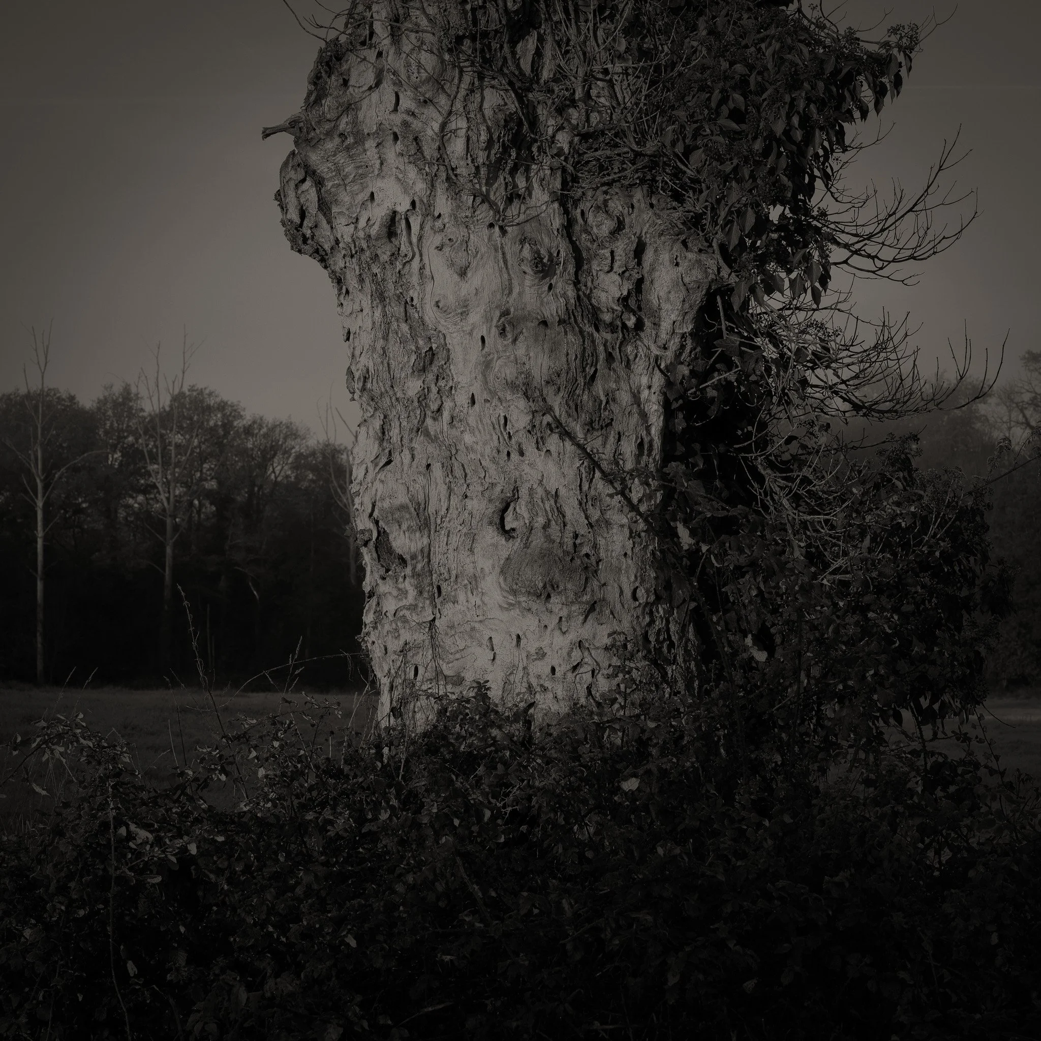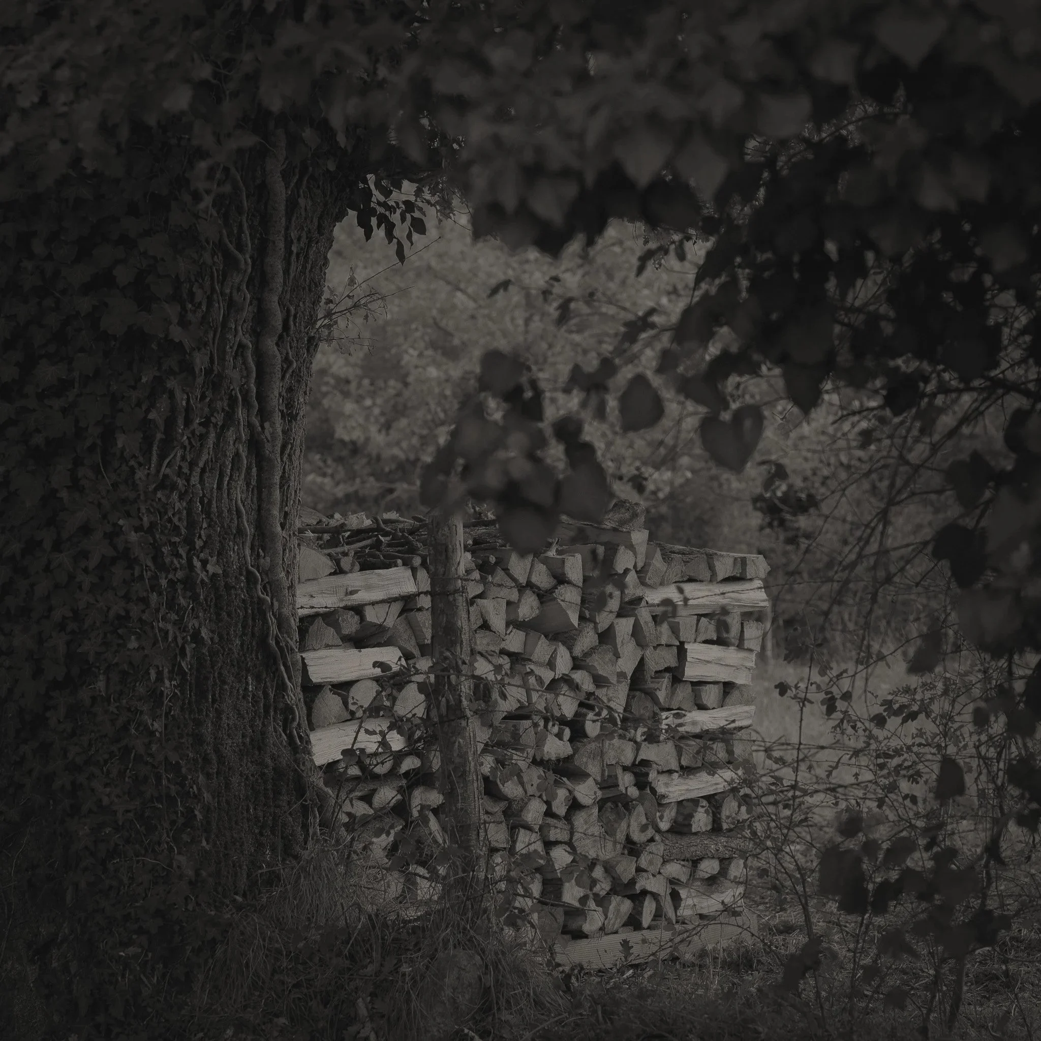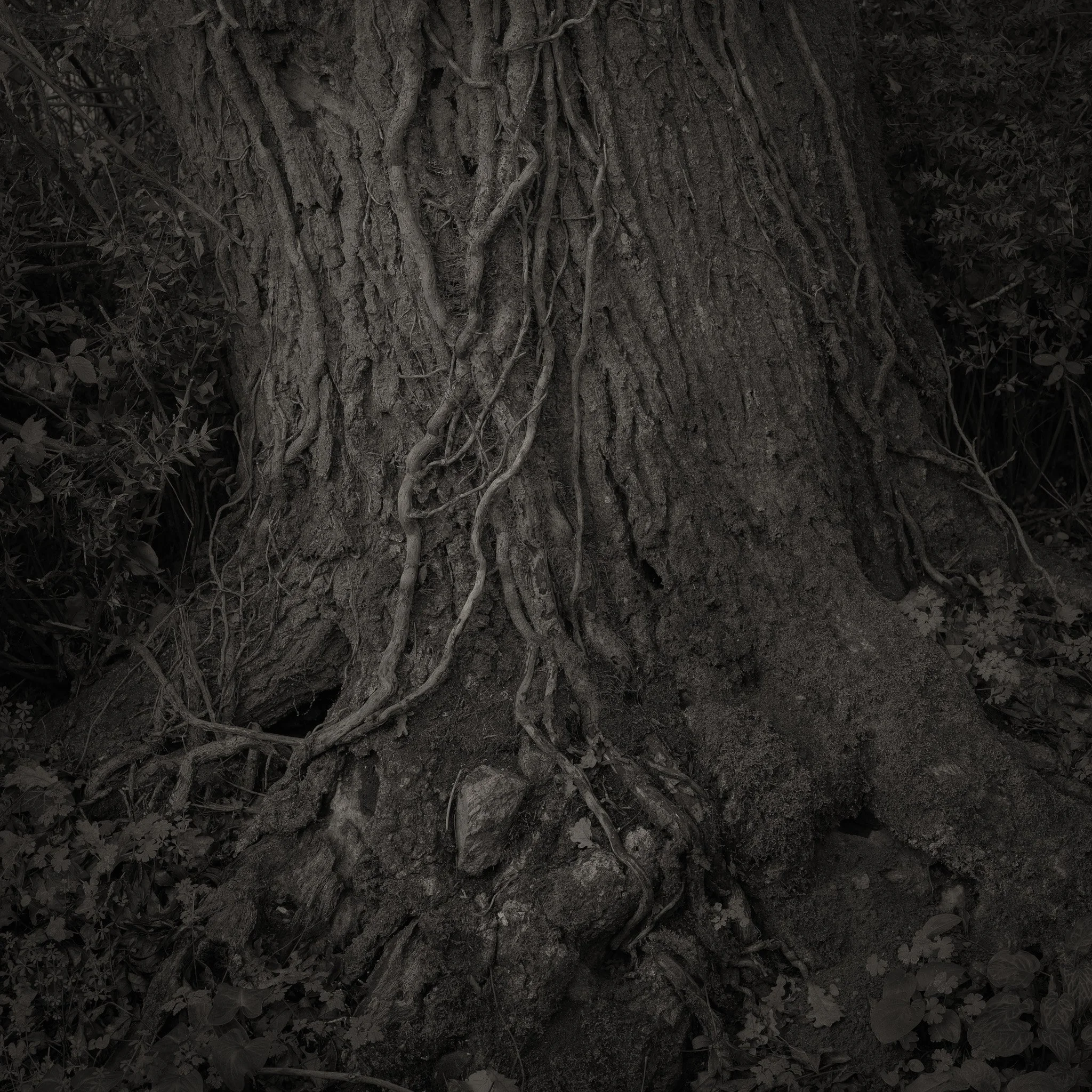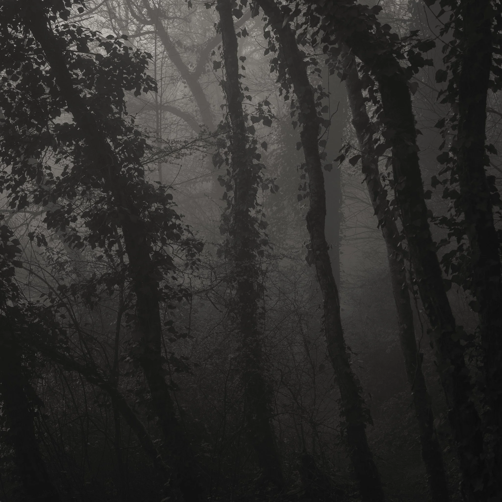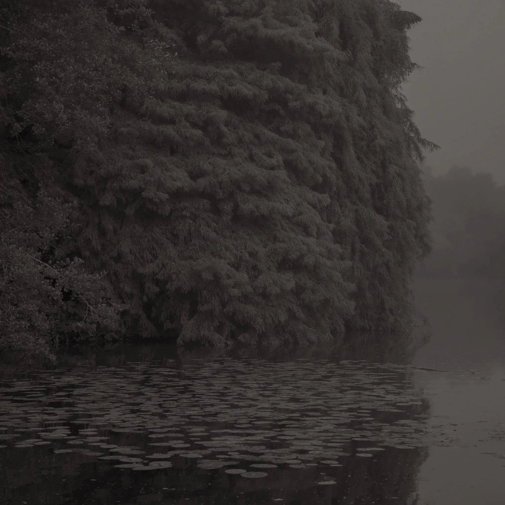 Le projet Green River est né d’une forme de sidération sauvage lorsqu’un véritable mur végétal s’est dressé devant moi un jour en déployant ses milliers de nuances du vert. Les branches des arbres centenaires s’emmêlaient aux ronces de plusieurs mètres qui interdisaient par moment le passage sur le chemin qui longeait la rivière. La Grande Maine se frayait la voie au milieu de cette forêt dense qui abritait de nombreuses espèces d’oiseaux et de mammifères sauvages. Elle offrait les ressources à tout le vivant qui campait sur ses deux rives. En explorant chaque jour ses méandres, elle est devenue également pour moi une ressource naturelle qui nourrit mon imagination. Des matinées brumeuses aux nuits de pleine lune quand sa lumière argentée se reflète dans ses eaux, de l’été sec, quand son niveau baisse mettant à nu les racines des arbres qui s’abreuvent dans son lit, à l’automne, quand sous la pluie abondante la mousse recouvre d’un vert profond les roches apparentes qui bordent son cours, la rivière m’offre au fil des jours cette substance perceptible, quasi monochrome à laquelle ma photographie tente d’apporter une nouvelle matérialité.
