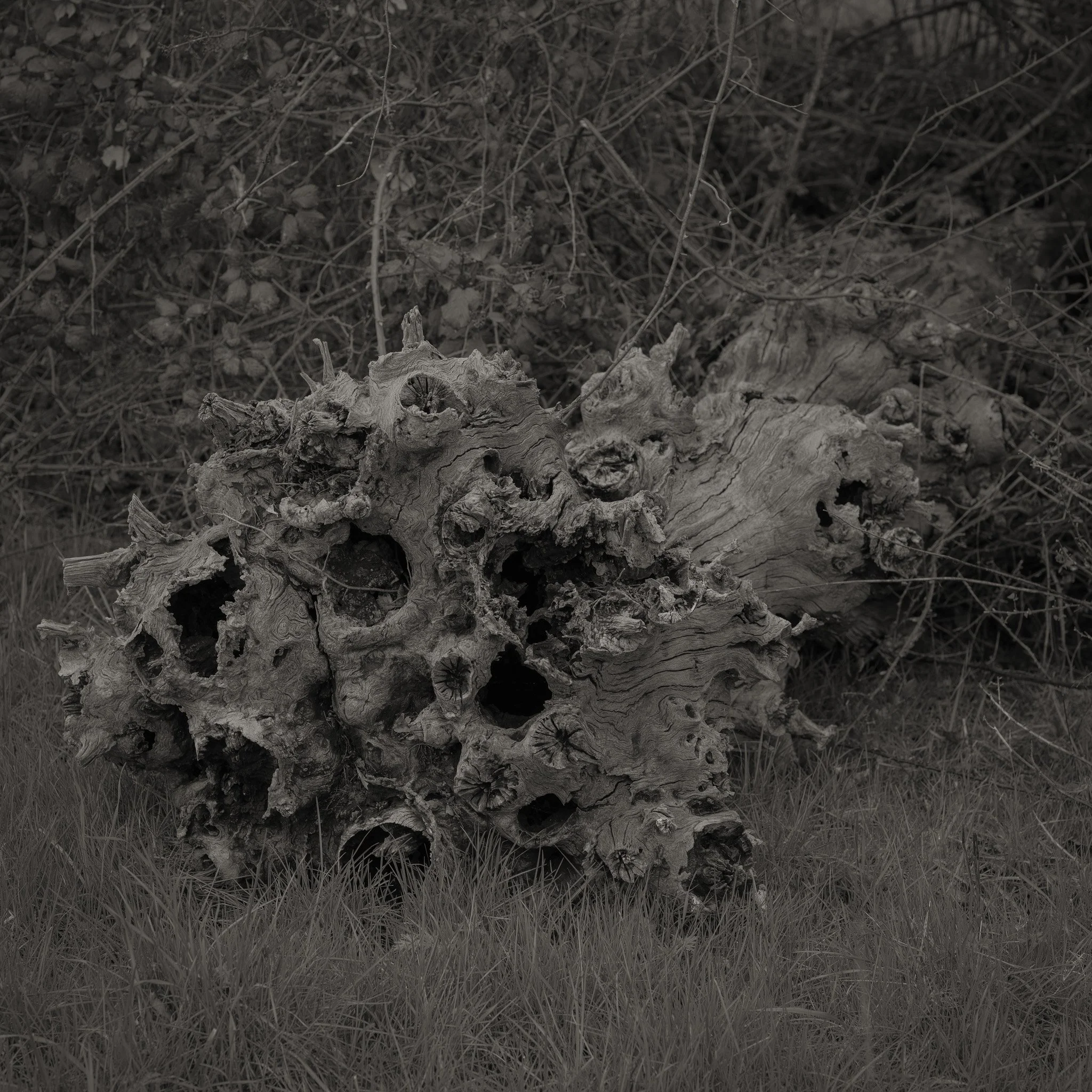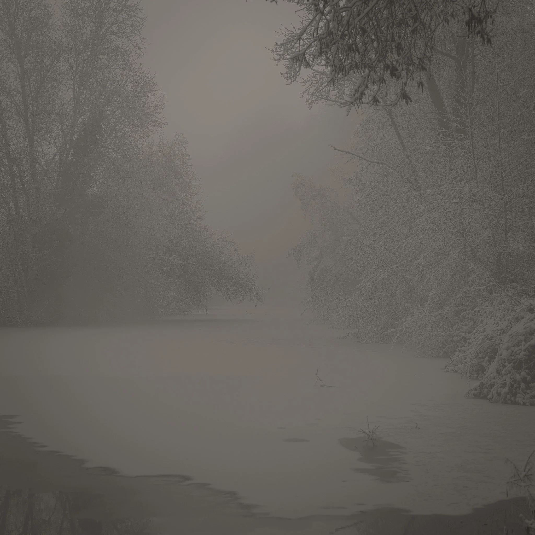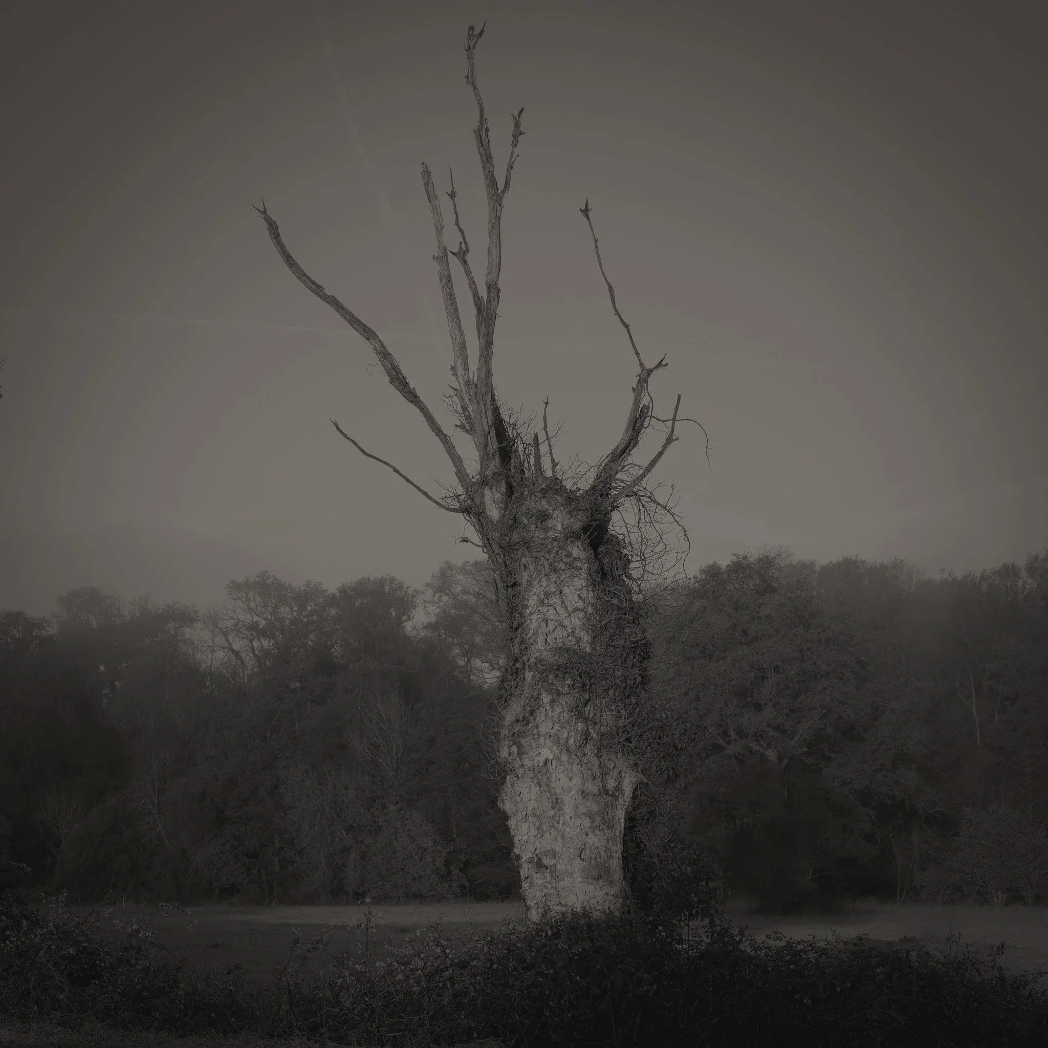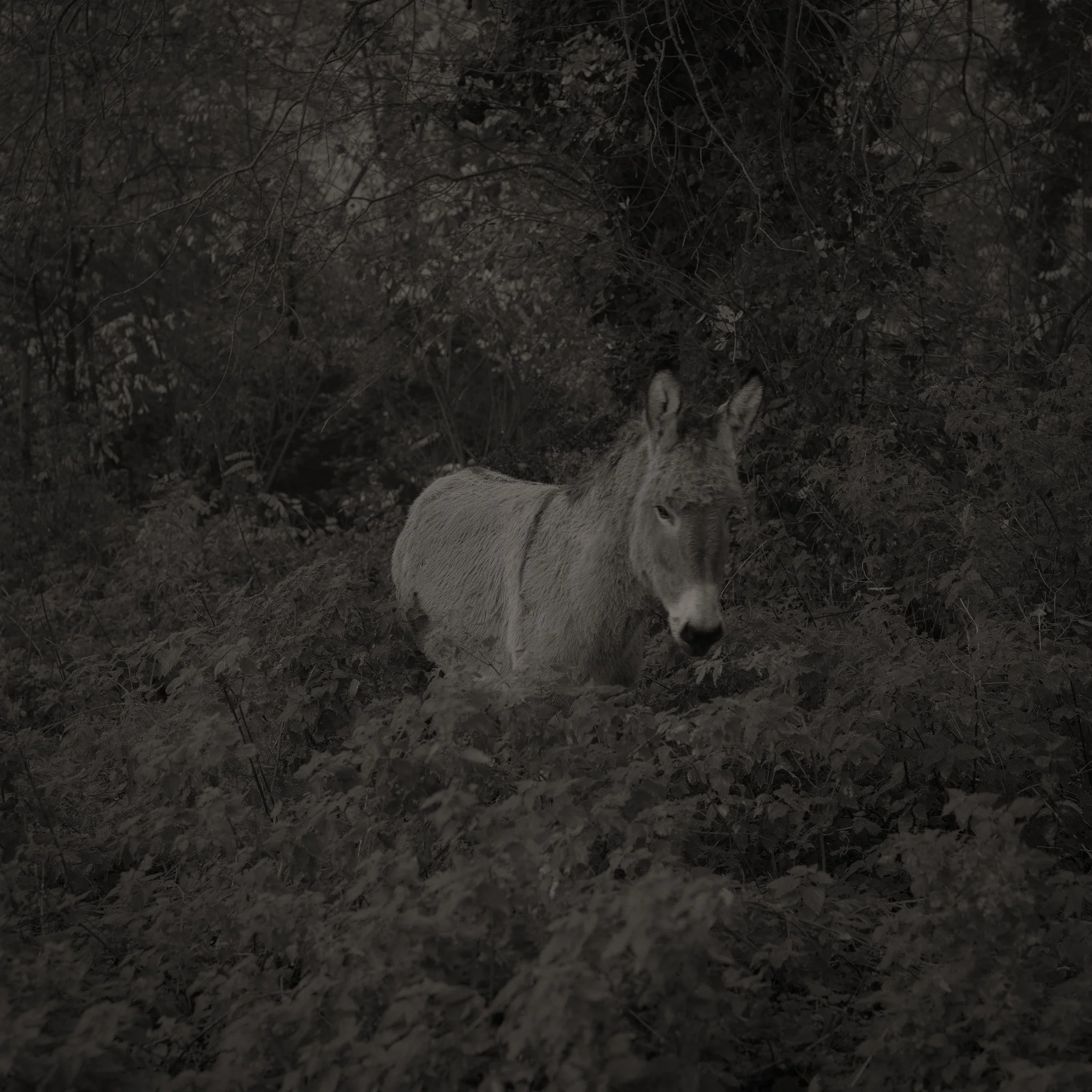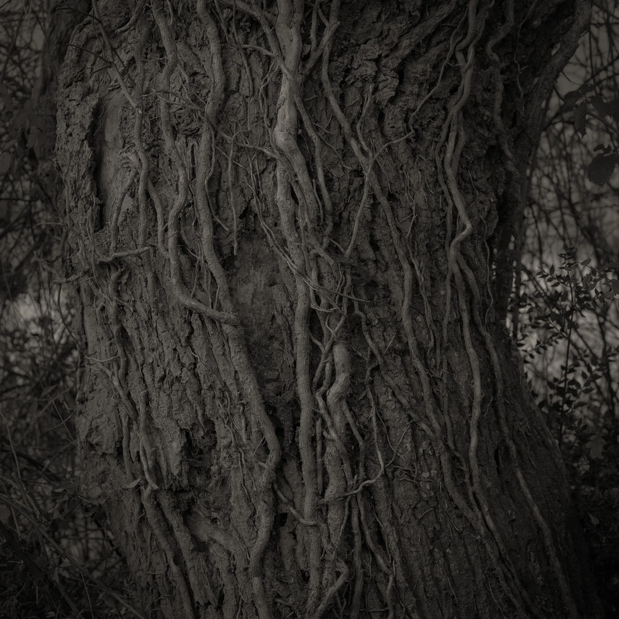 Le projet Green River est né d’une forme de sidération sauvage lorsqu’un véritable mur végétal s’est dressé devant moi un jour en déployant ses milliers de nuances du vert. Les branches des arbres centenaires s’emmêlaient aux ronces de plusieurs mètres qui interdisaient par moment le passage sur le chemin qui longeait la rivière. La Grande Maine se frayait la voie au milieu de cette forêt dense qui abritait de nombreuses espèces d’oiseaux et de mammifères sauvages. Elle offrait les ressources à tout le vivant qui campait sur ses deux rives. En explorant chaque jour ses méandres, elle est devenue également pour moi une ressource naturelle qui nourrit mon imagination. Des matinées brumeuses aux nuits de pleine lune quand sa lumière argentée se reflète dans ses eaux, de l’été sec, quand son niveau baisse mettant à nu les racines des arbres qui s’abreuvent dans son lit, à l’automne, quand sous la pluie abondante la mousse recouvre d’un vert profond les roches apparentes qui bordent son cours, la rivière m’offre au fil des jours cette substance perceptible, quasi monochrome à laquelle ma photographie tente d’apporter une nouvelle matérialité.