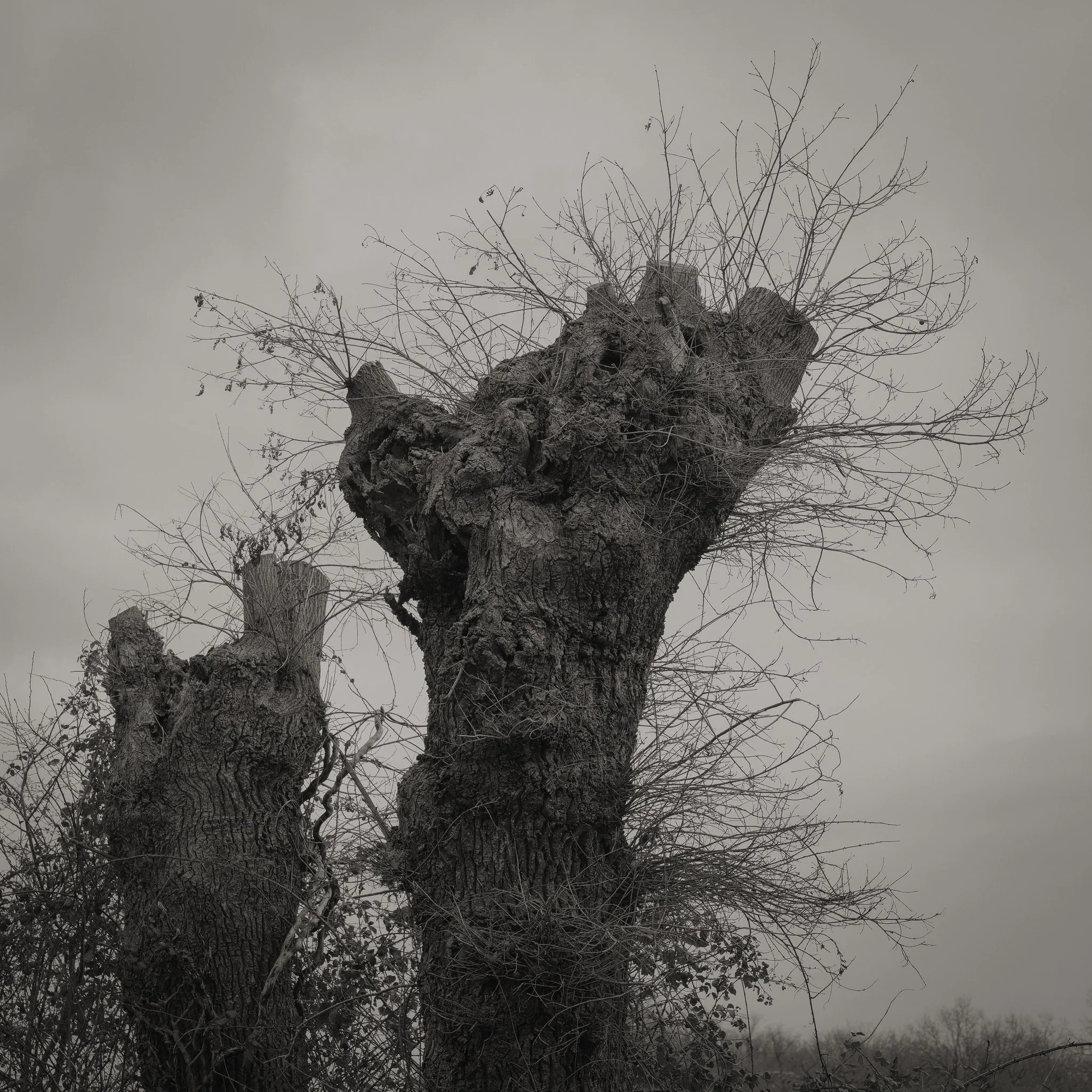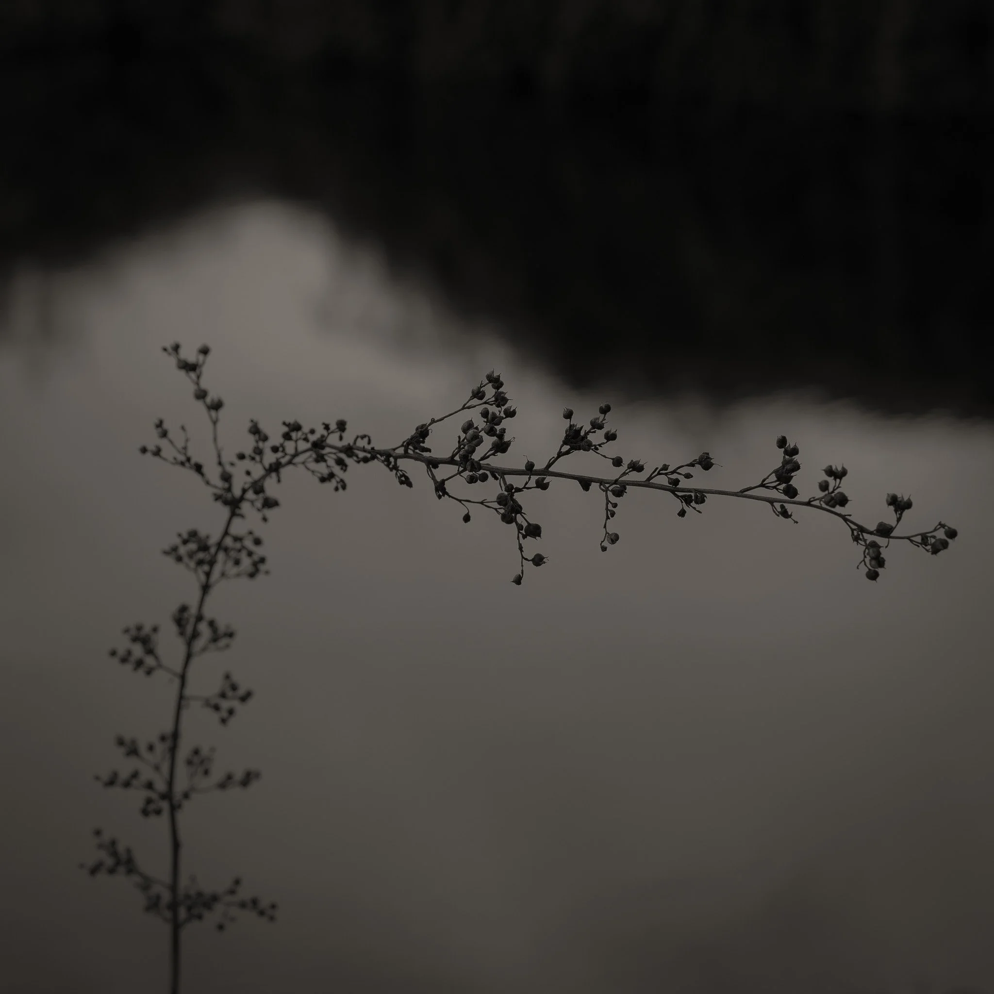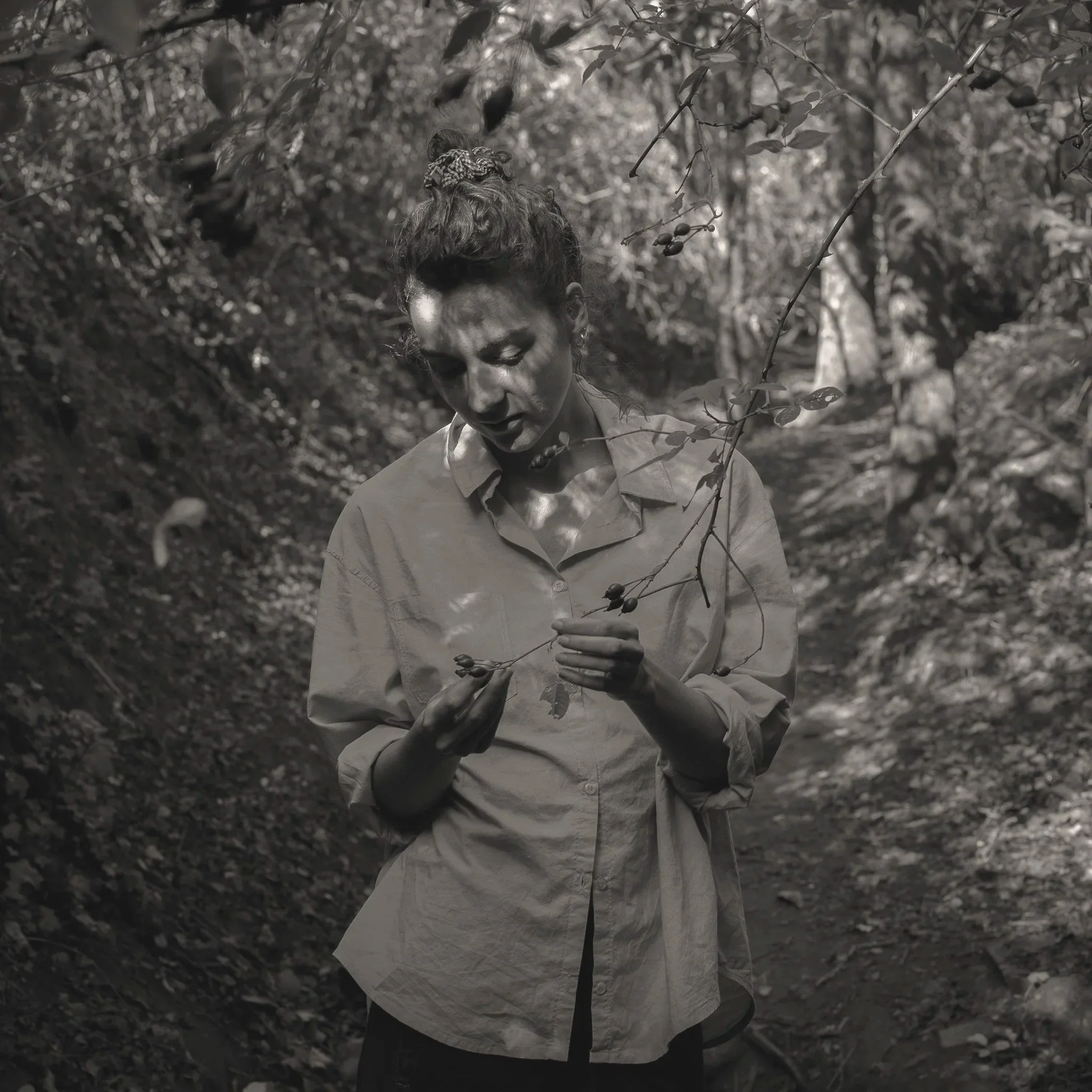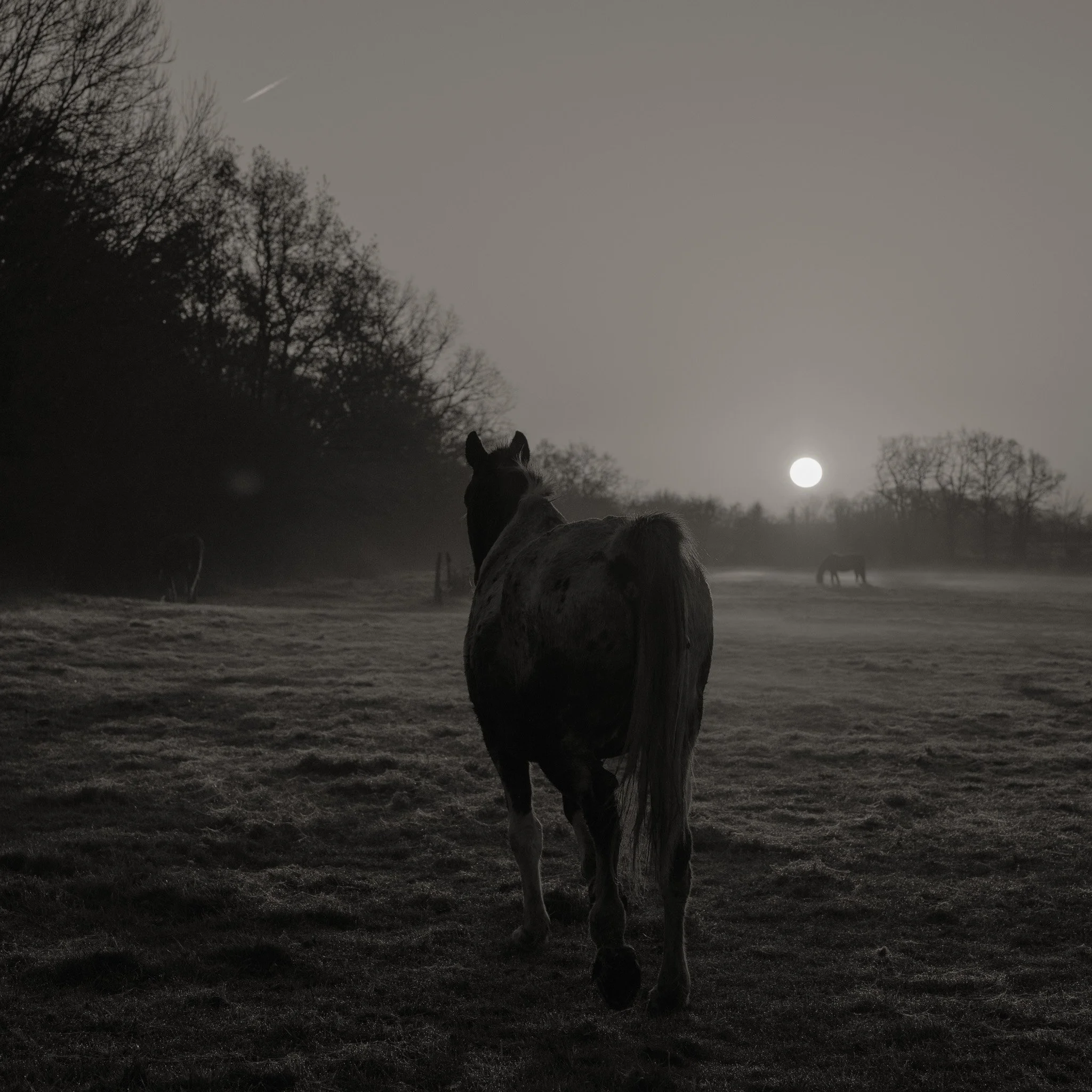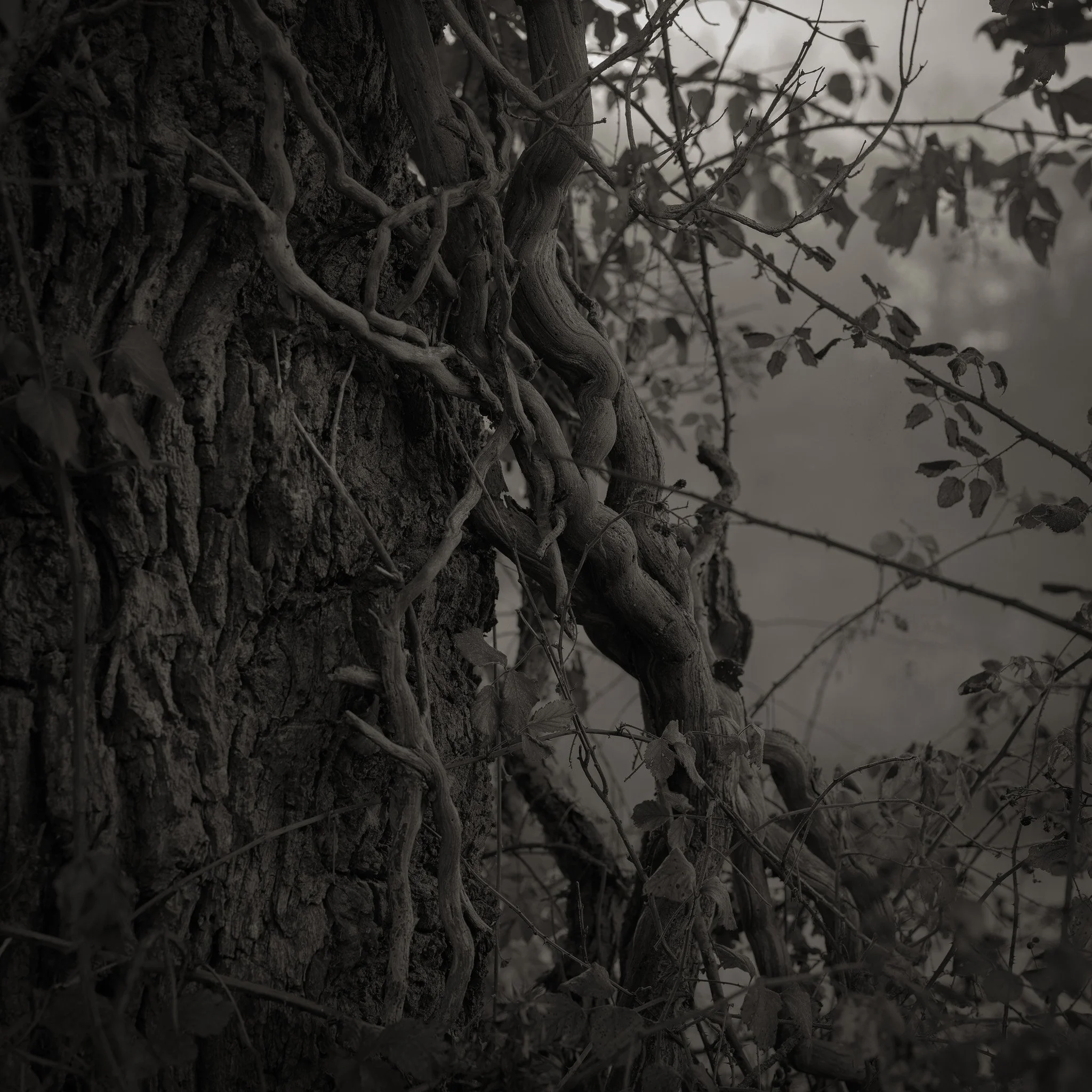 Le projet Green River est né d’une forme de sidération sauvage lorsqu’un véritable mur végétal s’est dressé devant moi un jour en déployant ses milliers de nuances du vert. Les branches des arbres centenaires s’emmêlaient aux ronces de plusieurs mètres qui interdisaient par moment le passage sur le chemin qui longeait la rivière. La Grande Maine se frayait la voie au milieu de cette forêt dense qui abritait de nombreuses espèces d’oiseaux et de mammifères sauvages. Elle offrait les ressources à tout le vivant qui campait sur ses deux rives. En explorant chaque jour ses méandres, elle est devenue également pour moi une ressource naturelle qui nourrit mon imagination. Des matinées brumeuses aux nuits de pleine lune quand sa lumière argentée se reflète dans ses eaux, de l’été sec, quand son niveau baisse mettant à nu les racines des arbres qui s’abreuvent dans son lit, à l’automne, quand sous la pluie abondante la mousse recouvre d’un vert profond les roches apparentes qui bordent son cours, la rivière m’offre au fil des jours cette substance perceptible, quasi monochrome à laquelle ma photographie tente d’apporter une nouvelle matérialité.